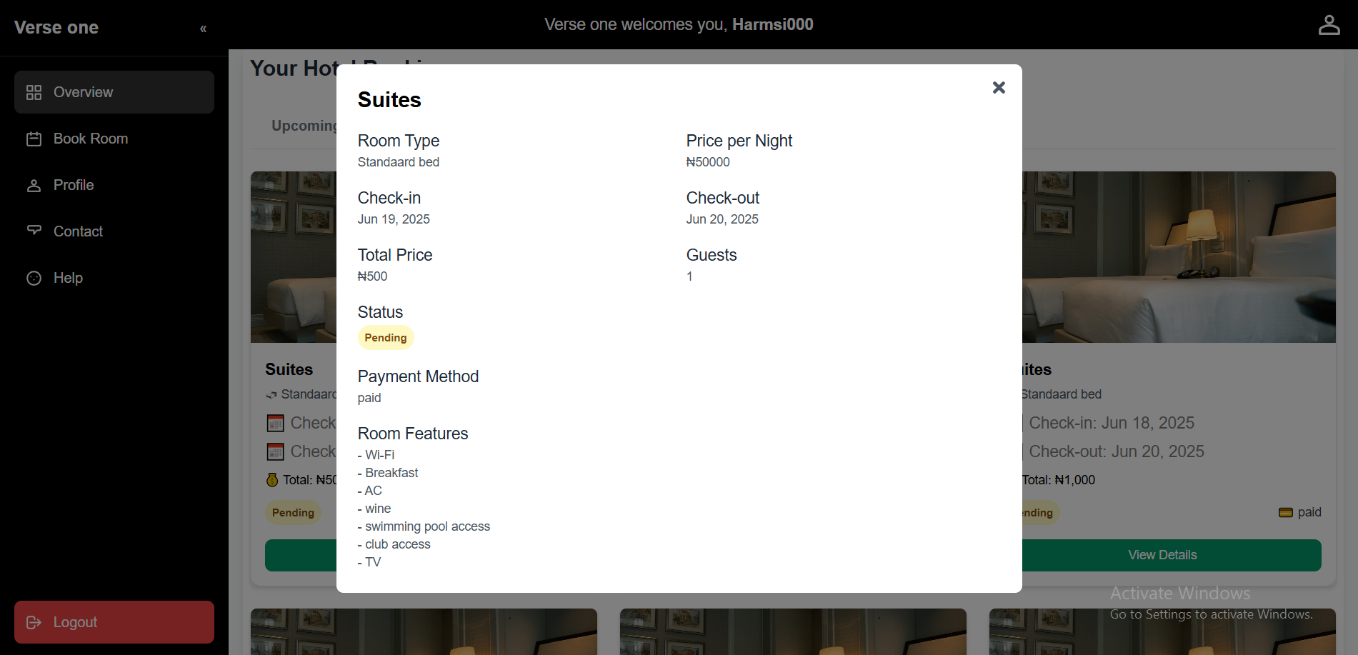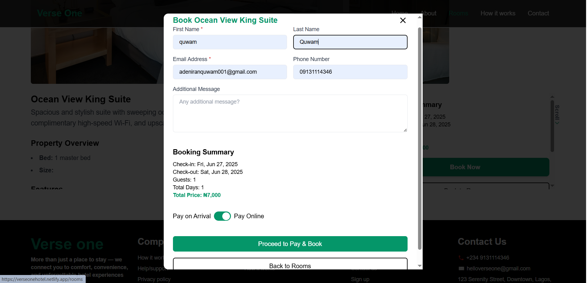 The platform now appears as the first or second result on Google for "Verse One Hotel" searches, demonstrating effective SEO implementation. The booking system handles real user transactions and provides hotels with complete control over their online presence.