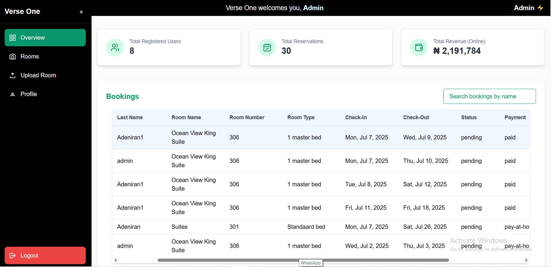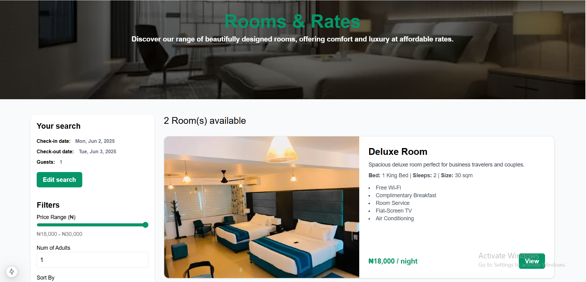 - ✓Comprehensive admin dashboard for room management and booking tracking